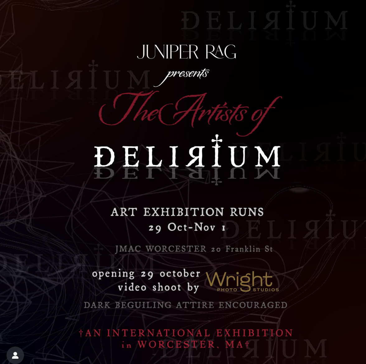 This killer exhibition brings a revenant and ethereal atmosphere to Worcester PopUp at the Jean McDonough Arts Center. DELIRIUM artwork will set a haunting and surreal tone, blurring the line between madness and a fever dream of shadows and beauty.